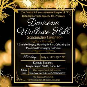 Please join the Central Arkansas Alumnae Chapter on Sunday, May 7, 2023 for the 2023 Dorisene Wallace Hill Scholarship Luncheon. This year’s luncheon theme is “A Cherished Legacy: Honoring the Past, Celebrating the Present and Encouraging the Future. Start time is 2:00 P.M. It will be held at The Greens at North Hills, 7400 Highway 107, Sherwood, Arkansas. Tickets are $40.00 and must be purchased via Eventbrite. Thank you in advance for joining us as we honor the life & legacy of our beloved Dorisene Wallace Hill and celebrate four Central Arkansas students on their academic achievements!