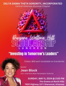Mark your calendar for the Central Arkansas Alumnae Chapter’s Dorisene Wallace Hill Scholarship Luncheon. This year, our luncheon theme is “Investing in Tomorrow’s Future.” Tickets are priced at $40.00 and can be purchased through Eventbrite. Please join us, as we pay tribute to the life and legacy of our cherished Dorisene Wallace Hill. We will also be honoring our recipients, along with their families, at this special event.