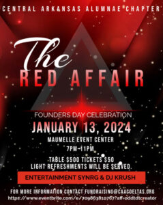 Description: The Central Arkansas Alumnae Chapter of Delta Sigma Theta Sorority, Inc. presents The Red Affair Celebration. Proceeds from this fundraiser will support CAAC’s programming and scholarships. This event will feature the sounds of SYNRG and DJ Krush, a 360 Photo Booth, and light refreshments.